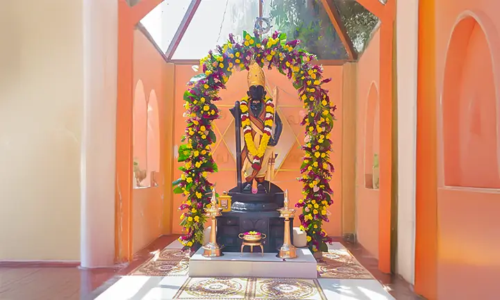 Within the sacred premises stands Lord Skanda’s majestic sanctum, adorned with soils from all six key Murugan sthalas. This embodiment of spiritual wisdom and courage blesses all seekers of knowledge and strength.